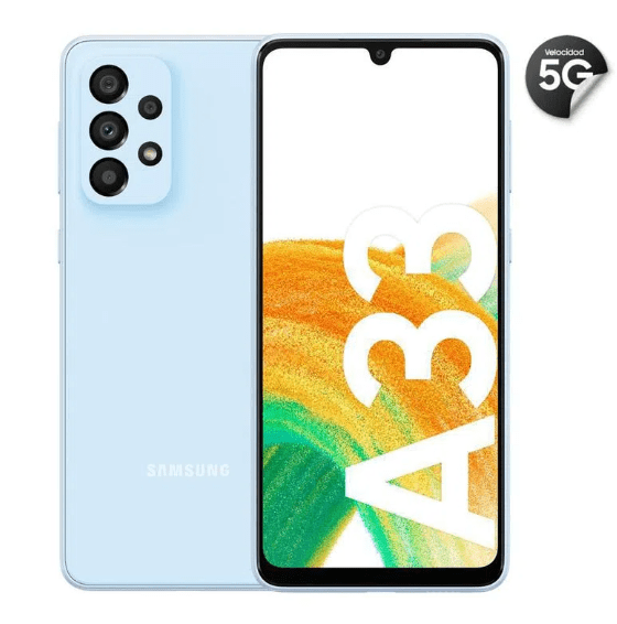 El Samsung Galaxy A33 5G es un smartphone Android con una pantalla Super AMOLED de 6.4 pulgadas con tasa de refresco de 90Hz, potenciado por por un procesador octa-core con 6GB y 128GB de almacenamiento interno expandible. El Galaxy A33 5G cuenta con una cámara cuádruple dorsal con cámara principal de 48MP, ultrawide de 8MP, macro de 5MP y profundidad de 2MP, siendo la cámara selfie de 16MP. Una batería de 5000 mAh de carga rápida alimenta al Galaxy A33 5G, que completa sus características con lector de huellas lateral, resistencia al polvo y agua, y corre Android 12.